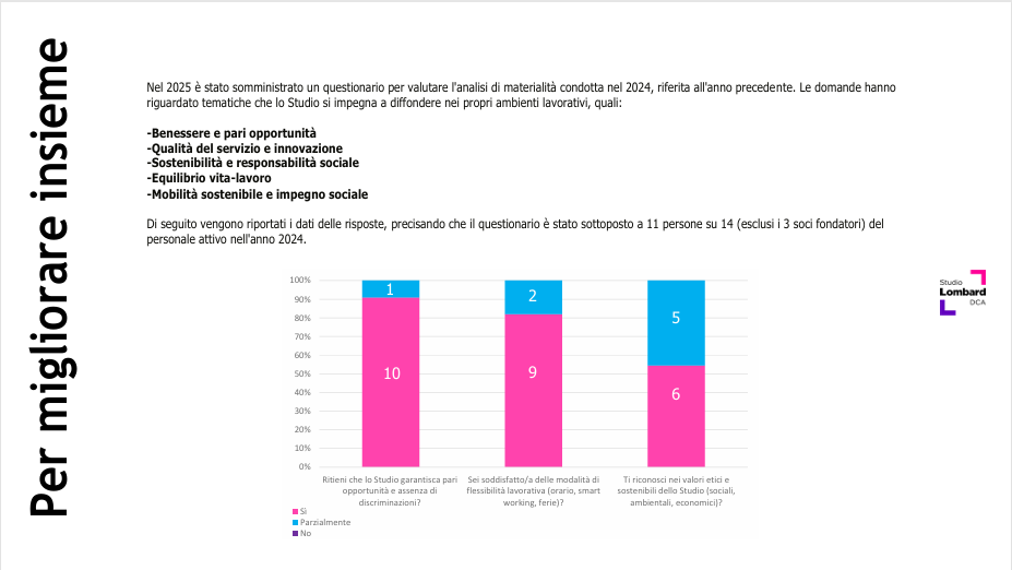Nel bilancio 2024 abbiamo voluto raccontare anche come si sta insieme all’interno dello studio. Oltre ai numeri, abbiamo cercato di capire il clima lavorativo, il livello di soddisfazione e i margini per migliorare il nostro modo di collaborare. Perché sentirsi parte di un progetto comune è ciò che ci permette di valorizzare ogni competenza.